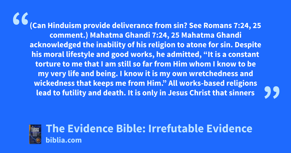 (Can Hinduism provide deliverance from sin? See Romans 7:24, 25 comment.) Mahatma Ghandi 7:24, 25 Mahatma Ghandi acknowledged the inability of his religion to atone for sin. Despite his moral lifestyle and good works, he admitted, “It is a constant torture to me that I am still so far from Him whom I know to be my very life and being. I know it is my own wretchedness and wickedness that keeps me from Him.” All works-based religions lead to futility and death. It is only in Jesus Christ that sinners