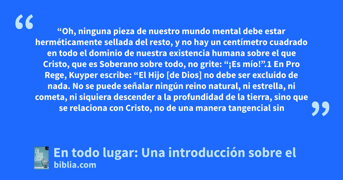 “Oh, ninguna pieza de nuestro mundo mental debe estar herméticamente sellada del resto, y no hay un centímetro cuadrado en todo el dominio de nuestra existencia humana sobre el que Cristo, que es Soberano sobre todo, no grite: “¡Es mío!”.1 En Pro Rege, Kuyper escribe: “El Hijo [de Dios] no debe ser excluido de nada. No se puede señalar ningún reino natural, ni estrella, ni cometa, ni siquiera descender a la profundidad de la tierra, sino que se relaciona con Cristo, no de una manera tangencial sin