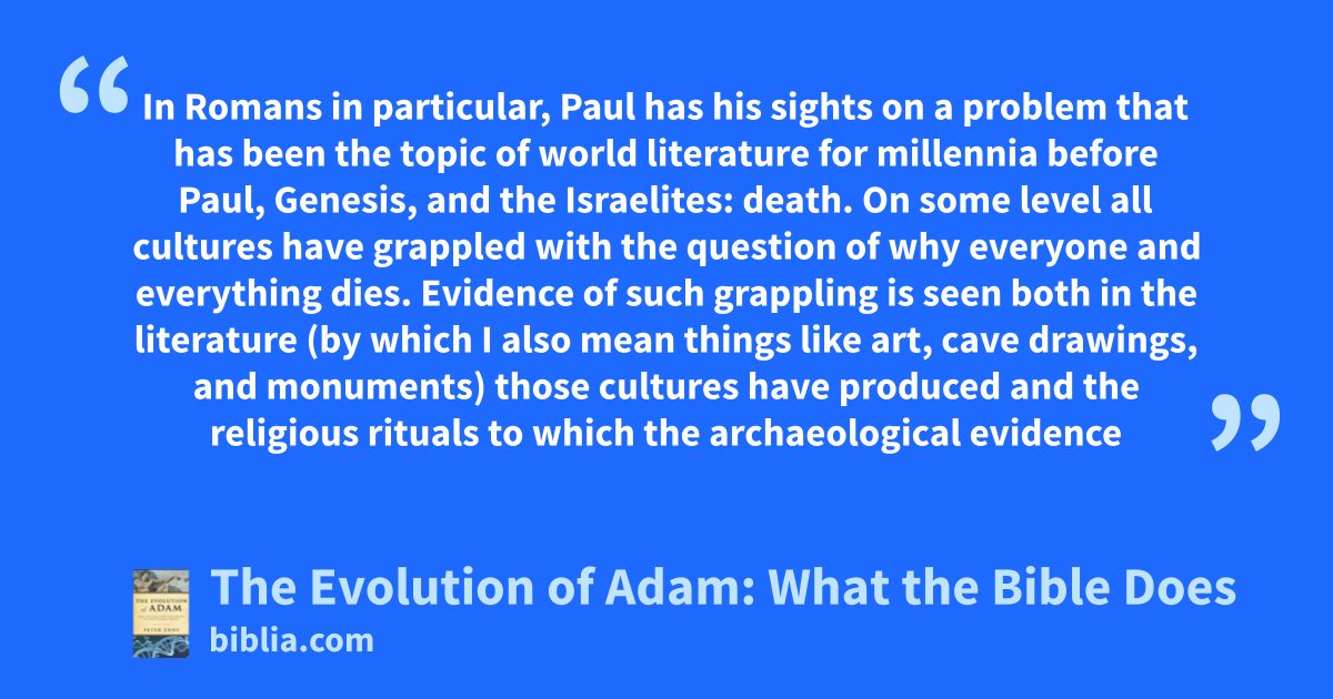 In Romans in particular, Paul has his sights on a problem that has been the topic of world literature for millennia before Paul, Genesis, and the Israelites: death. On some level all cultures have grappled with the question of why everyone and everything dies. Evidence of such grappling is seen both in the literature (by which I also mean things like art, cave drawings, and monuments) those cultures have produced and the religious rituals to which the archaeological evidence