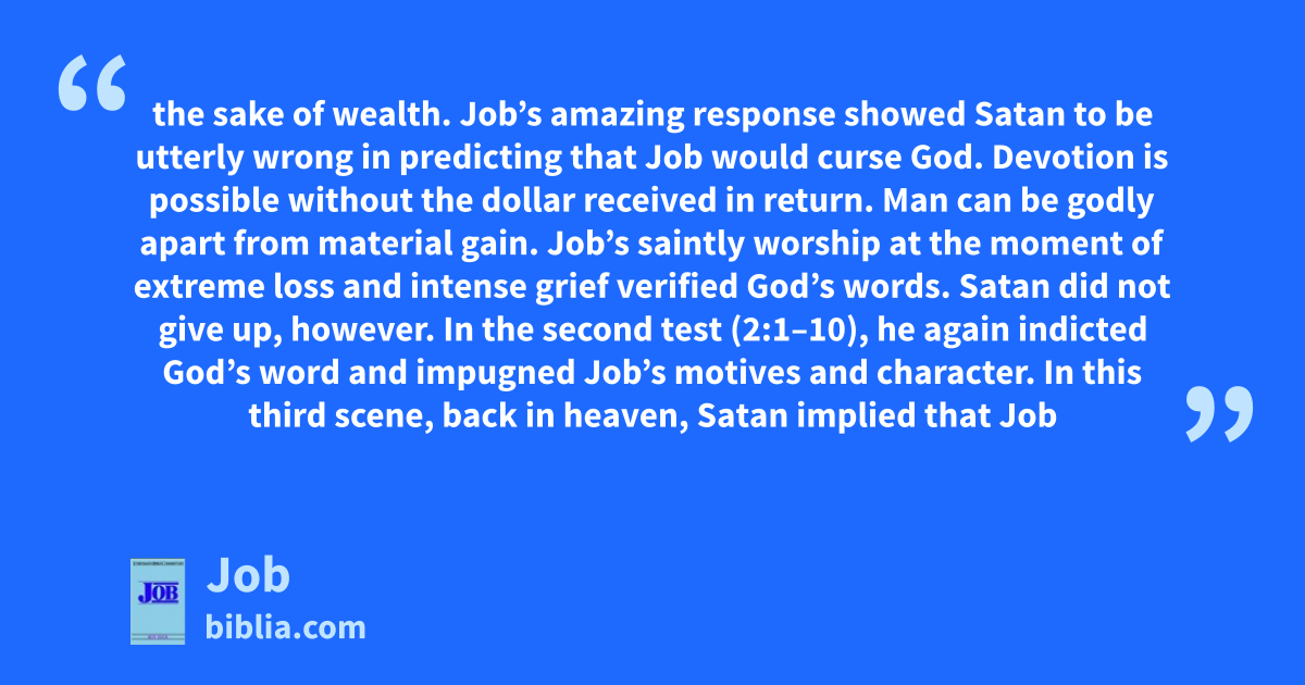 the sake of wealth. Job’s amazing response showed Satan to be utterly wrong in predicting that Job would curse God. Devotion is possible without the dollar received in return. Man can be godly apart from material gain. Job’s saintly worship at the moment of extreme loss and intense grief verified God’s words. Satan did not give up, however. In the second test (2:1–10), he again indicted God’s word and impugned Job’s motives and character. In this third scene, back in heaven, Satan implied that Job