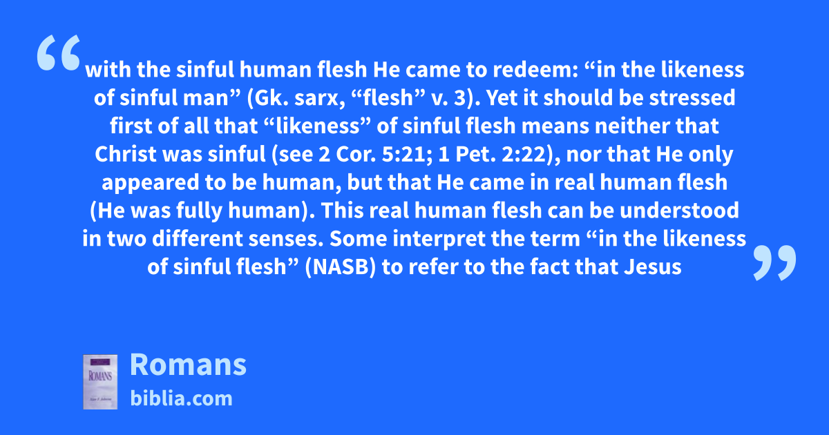 with the sinful human flesh He came to redeem: “in the likeness of sinful man” (Gk. sarx, “flesh” v. 3). Yet it should be stressed first of all that “likeness” of sinful flesh means neither that Christ was sinful (see 2 Cor. 5:21; 1 Pet. 2:22), nor that He only appeared to be human, but that He came in real human flesh (He was fully human). This real human flesh can be understood in two different senses. Some interpret the term “in the likeness of sinful flesh” (NASB) to refer to the fact that Jesus