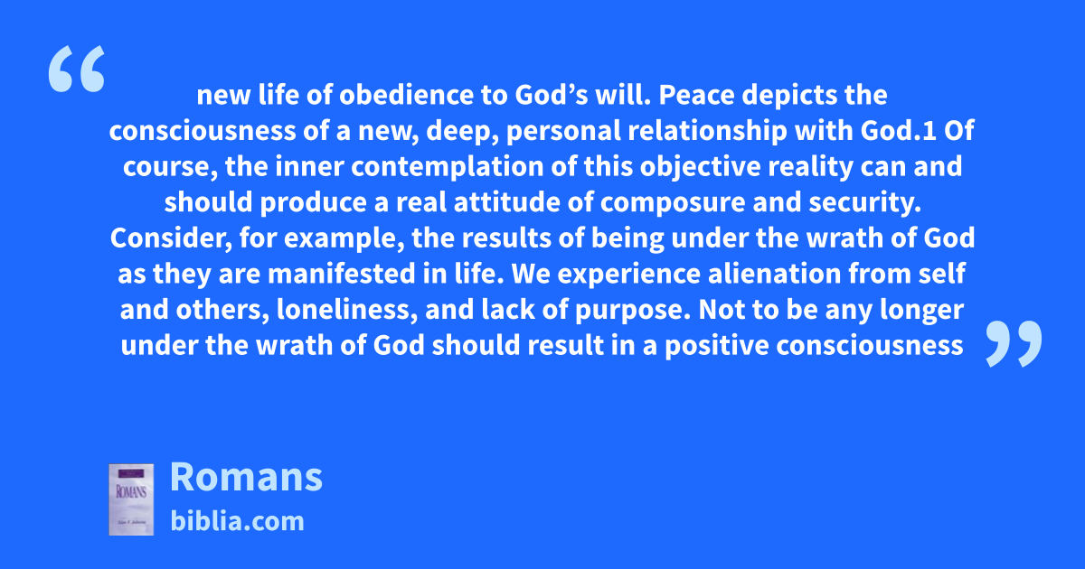 new life of obedience to God’s will. Peace depicts the consciousness of a new, deep, personal relationship with God.1 Of course, the inner contemplation of this objective reality can and should produce a real attitude of composure and security. Consider, for example, the results of being under the wrath of God as they are manifested in life. We experience alienation from self and others, loneliness, and lack of purpose. Not to be any longer under the wrath of God should result in a positive consciousness