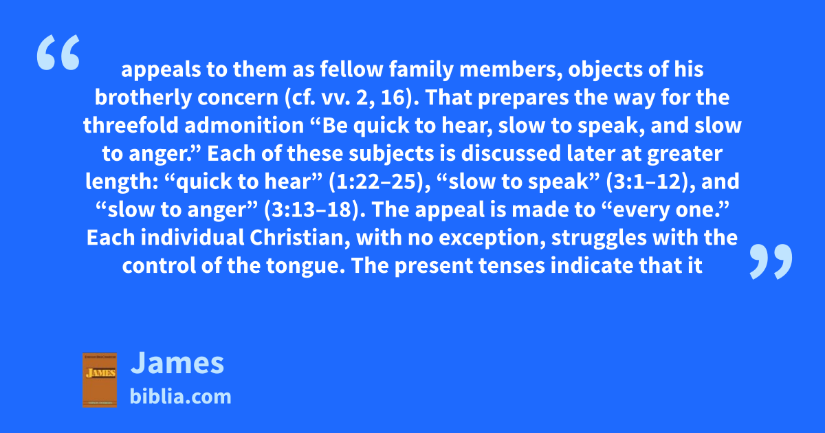 appeals to them as fellow family members, objects of his brotherly concern (cf. vv. 2, 16). That prepares the way for the threefold admonition “Be quick to hear, slow to speak, and slow to anger.” Each of these subjects is discussed later at greater length: “quick to hear” (1:22–25), “slow to speak” (3:1–12), and “slow to anger” (3:13–18). The appeal is made to “every one.” Each individual Christian, with no exception, struggles with the control of the tongue. The present tenses indicate that it