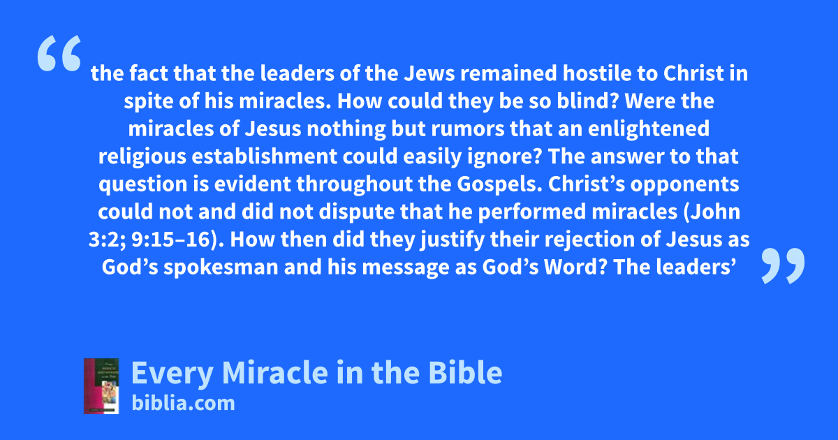 the fact that the leaders of the Jews remained hostile to Christ in spite of his miracles. How could they be so blind? Were the miracles of Jesus nothing but rumors that an enlightened religious establishment could easily ignore? The answer to that question is evident throughout the Gospels. Christ’s opponents could not and did not dispute that he performed miracles (John 3:2; 9:15–16). How then did they justify their rejection of Jesus as God’s spokesman and his message as God’s Word? The leaders’