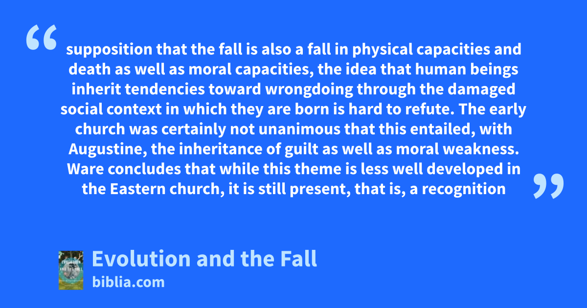 supposition that the fall is also a fall in physical capacities and death as well as moral capacities, the idea that human beings inherit tendencies toward wrongdoing through the damaged social context in which they are born is hard to refute. The early church was certainly not unanimous that this entailed, with Augustine, the inheritance of guilt as well as moral weakness. Ware concludes that while this theme is less well developed in the Eastern church, it is still present, that is, a recognition