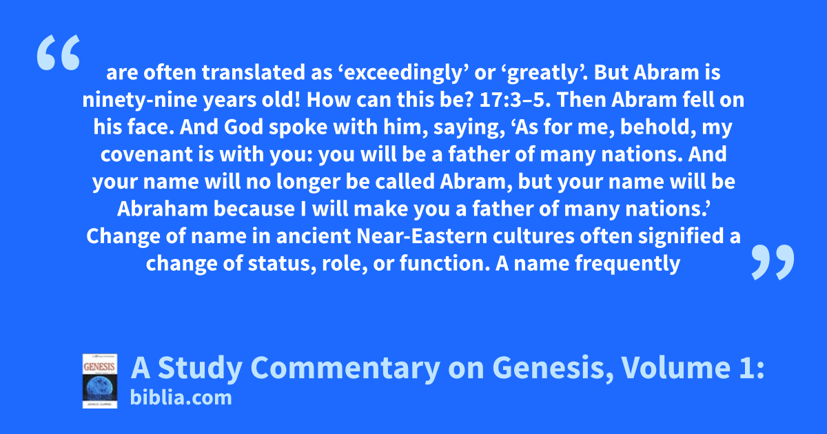 are often translated as ‘exceedingly’ or ‘greatly’. But Abram is ninety-nine years old! How can this be? 17:3–5. Then Abram fell on his face. And God spoke with him, saying, ‘As for me, behold, my covenant is with you: you will be a father of many nations. And your name will no longer be called Abram, but your name will be Abraham because I will make you a father of many nations.’ Change of name in ancient Near-Eastern cultures often signified a change of status, role, or function. A name frequently
