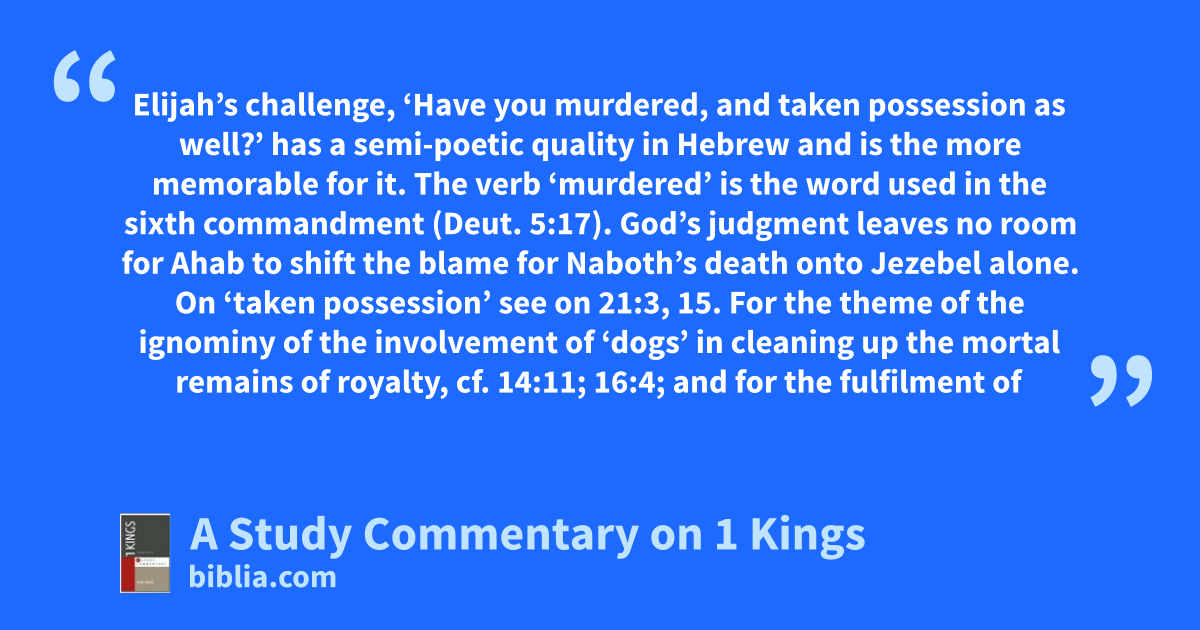 Elijah’s challenge, ‘Have you murdered, and taken possession as well?’ has a semi-poetic quality in Hebrew and is the more memorable for it. The verb ‘murdered’ is the word used in the sixth commandment (Deut. 5:17). God’s judgment leaves no room for Ahab to shift the blame for Naboth’s death onto Jezebel alone. On ‘taken possession’ see on 21:3, 15. For the theme of the ignominy of the involvement of ‘dogs’ in cleaning up the mortal remains of royalty, cf. 14:11; 16:4; and for the fulfilment of