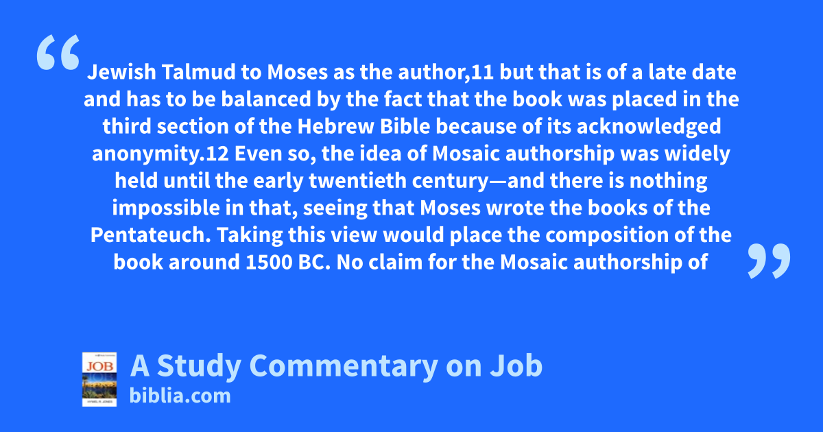 Jewish Talmud to Moses as the author,11 but that is of a late date and has to be balanced by the fact that the book was placed in the third section of the Hebrew Bible because of its acknowledged anonymity.12 Even so, the idea of Mosaic authorship was widely held until the early twentieth century—and there is nothing impossible in that, seeing that Moses wrote the books of the Pentateuch. Taking this view would place the composition of the book around 1500 BC. No claim for the Mosaic authorship of