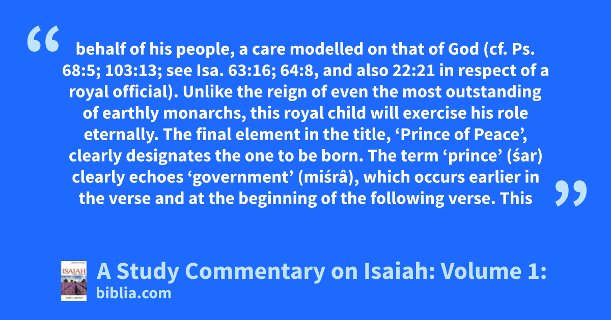 behalf of his people, a care modelled on that of God (cf. Ps. 68:5; 103:13; see Isa. 63:16; 64:8, and also 22:21 in respect of a royal official). Unlike the reign of even the most outstanding of earthly monarchs, this royal child will exercise his role eternally. The final element in the title, ‘Prince of Peace’, clearly designates the one to be born. The term ‘prince’ (śar) clearly echoes ‘government’ (miśrâ), which occurs earlier in the verse and at the beginning of the following verse. This