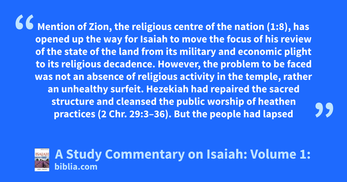 Mention of Zion, the religious centre of the nation (1:8), has opened up the way for Isaiah to move the focus of his review of the state of the land from its military and economic plight to its religious decadence. However, the problem to be faced was not an absence of religious activity in the temple, rather an unhealthy surfeit. Hezekiah had repaired the sacred structure and cleansed the public worship of heathen practices (2 Chr. 29:3–36). But the people had lapsed