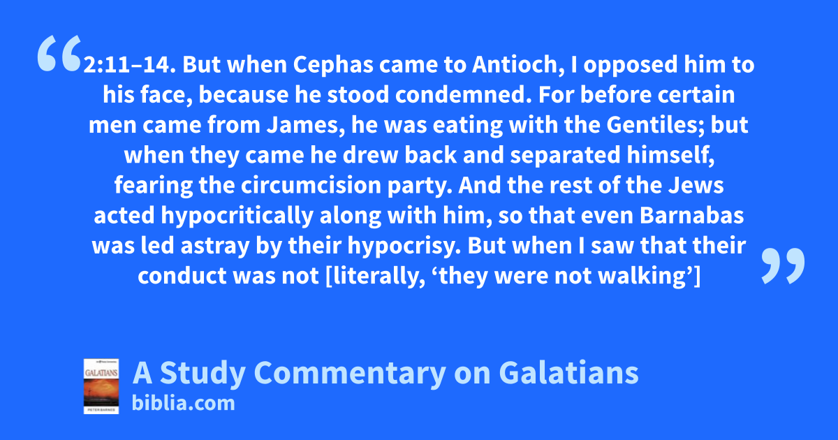 2:11–14. But when Cephas came to Antioch, I opposed him to his face, because he stood condemned. For before certain men came from James, he was eating with the Gentiles; but when they came he drew back and separated himself, fearing the circumcision party. And the rest of the Jews acted hypocritically along with him, so that even Barnabas was led astray by their hypocrisy. But when I saw that their conduct was not [literally, ‘they were not walking’]