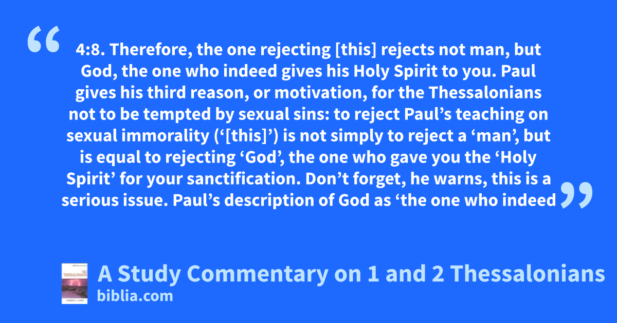 4:8. Therefore, the one rejecting [this] rejects not man, but God, the one who indeed gives his Holy Spirit to you. Paul gives his third reason, or motivation, for the Thessalonians not to be tempted by sexual sins: to reject Paul’s teaching on sexual immorality (‘[this]’) is not simply to reject a ‘man’, but is equal to rejecting ‘God’, the one who gave you the ‘Holy Spirit’ for your sanctification. Don’t forget, he warns, this is a serious issue. Paul’s description of God as ‘the one who indeed