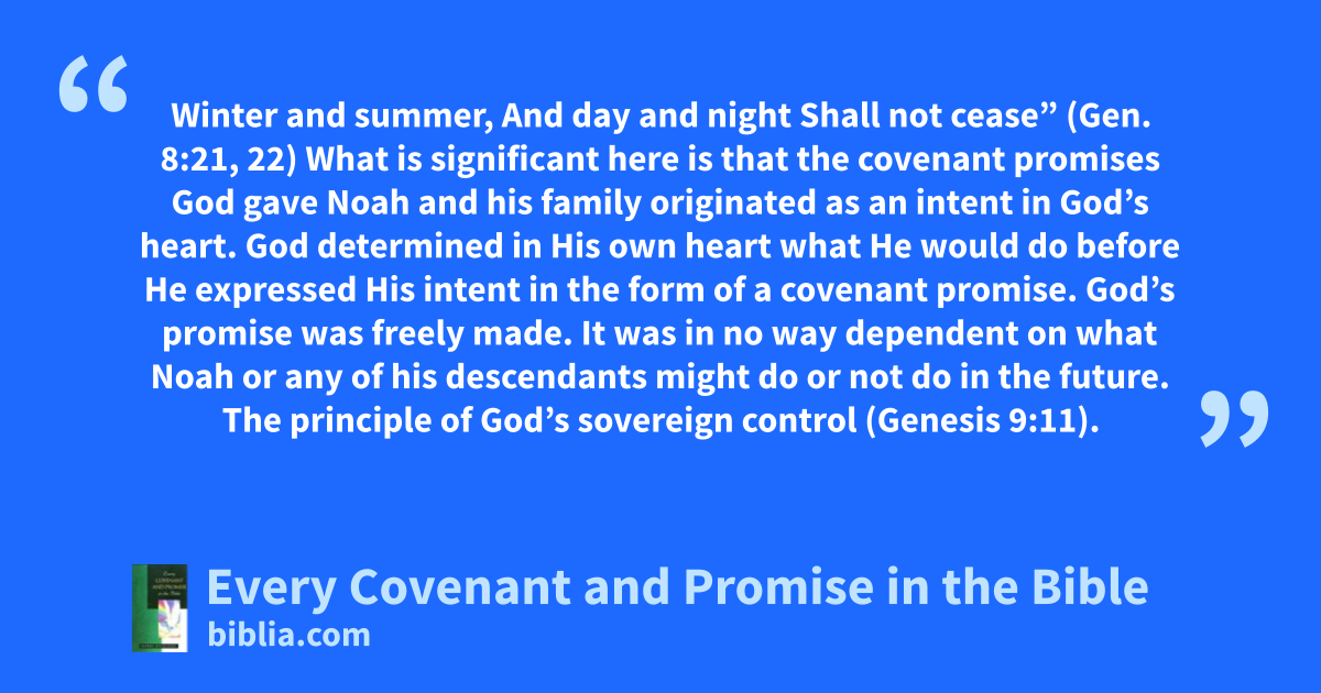 Winter and summer, And day and night Shall not cease” (Gen. 8:21, 22) What is significant here is that the covenant promises God gave Noah and his family originated as an intent in God’s heart. God determined in His own heart what He would do before He expressed His intent in the form of a covenant promise. God’s promise was freely made. It was in no way dependent on what Noah or any of his descendants might do or not do in the future. The principle of God’s sovereign control (Genesis 9:11).