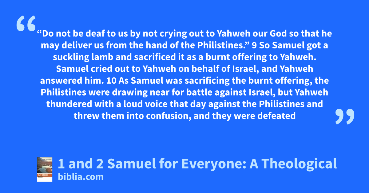 “Do not be deaf to us by not crying out to Yahweh our God so that he may deliver us from the hand of the Philistines.” 9 So Samuel got a suckling lamb and sacrificed it as a burnt offering to Yahweh. Samuel cried out to Yahweh on behalf of Israel, and Yahweh answered him. 10 As Samuel was sacrificing the burnt offering, the Philistines were drawing near for battle against Israel, but Yahweh thundered with a loud voice that day against the Philistines and threw them into confusion, and they were defeated