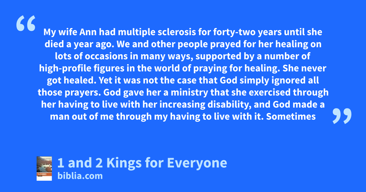 My wife Ann had multiple sclerosis for forty-two years until she died a year ago. We and other people prayed for her healing on lots of occasions in many ways, supported by a number of high-profile figures in the world of praying for healing. She never got healed. Yet it was not the case that God simply ignored all those prayers. God gave her a ministry that she exercised through her having to live with her increasing disability, and God made a man out of me through my having to live with it. Sometimes