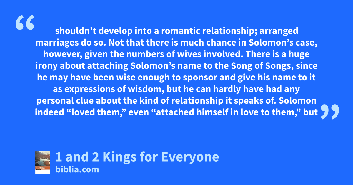 shouldn’t develop into a romantic relationship; arranged marriages do so. Not that there is much chance in Solomon’s case, however, given the numbers of wives involved. There is a huge irony about attaching Solomon’s name to the Song of Songs, since he may have been wise enough to sponsor and give his name to it as expressions of wisdom, but he can hardly have had any personal clue about the kind of relationship it speaks of. Solomon indeed “loved them,” even “attached himself in love to them,” but