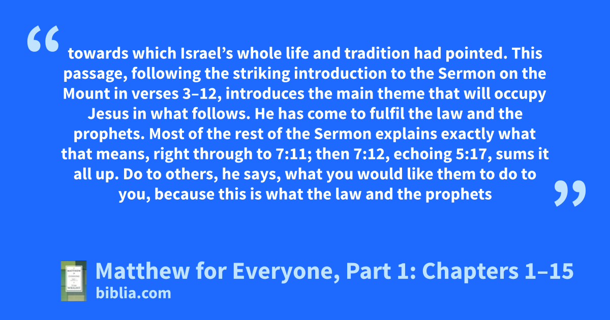 towards which Israel’s whole life and tradition had pointed. This passage, following the striking introduction to the Sermon on the Mount in verses 3–12, introduces the main theme that will occupy Jesus in what follows. He has come to fulfil the law and the prophets. Most of the rest of the Sermon explains exactly what that means, right through to 7:11; then 7:12, echoing 5:17, sums it all up. Do to others, he says, what you would like them to do to you, because this is what the law and the prophets