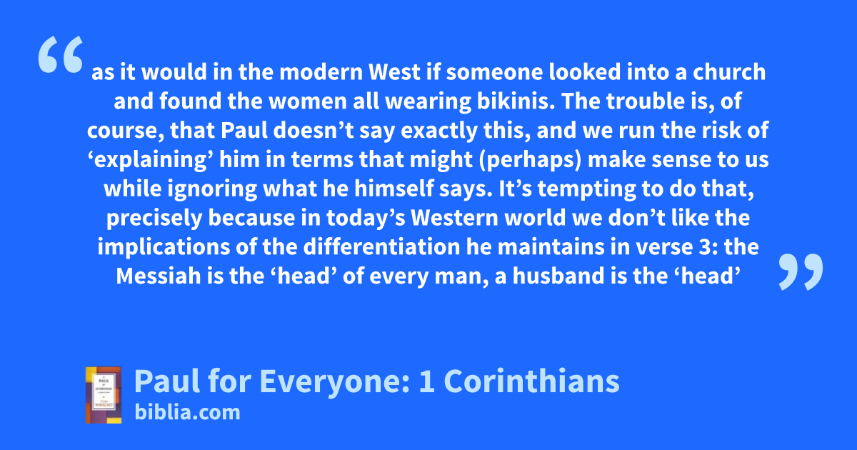 as it would in the modern West if someone looked into a church and found the women all wearing bikinis. The trouble is, of course, that Paul doesn’t say exactly this, and we run the risk of ‘explaining’ him in terms that might (perhaps) make sense to us while ignoring what he himself says. It’s tempting to do that, precisely because in today’s Western world we don’t like the implications of the differentiation he maintains in verse 3: the Messiah is the ‘head’ of every man, a husband is the ‘head’