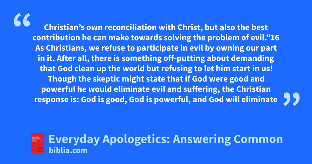 Christian’s own reconciliation with Christ, but also the best contribution he can make towards solving the problem of evil.”16 As Christians, we refuse to participate in evil by owning our part in it. After all, there is something off-putting about demanding that God clean up the world but refusing to let him start in us! Though the skeptic might state that if God were good and powerful he would eliminate evil and suffering, the Christian response is: God is good, God is powerful, and God will eliminate
