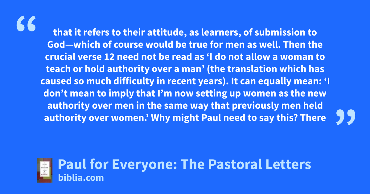 that it refers to their attitude, as learners, of submission to God—which of course would be true for men as well. Then the crucial verse 12 need not be read as ‘I do not allow a woman to teach or hold authority over a man’ (the translation which has caused so much difficulty in recent years). It can equally mean: ‘I don’t mean to imply that I’m now setting up women as the new authority over men in the same way that previously men held authority over women.’ Why might Paul need to say this? There