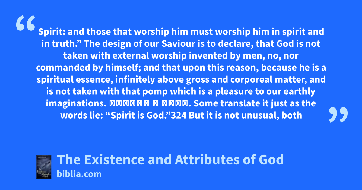 Spirit: and those that worship him must worship him in spirit and in truth.” The design of our Saviour is to declare, that God is not taken with external worship invented by men, no, nor commanded by himself; and that upon this reason, because he is a spiritual essence, infinitely above gross and corporeal matter, and is not taken with that pomp which is a pleasure to our earthly imaginations. Πνεῦμα ὁ θεός. Some translate it just as the words lie: “Spirit is God.”324 But it is not unusual, both
