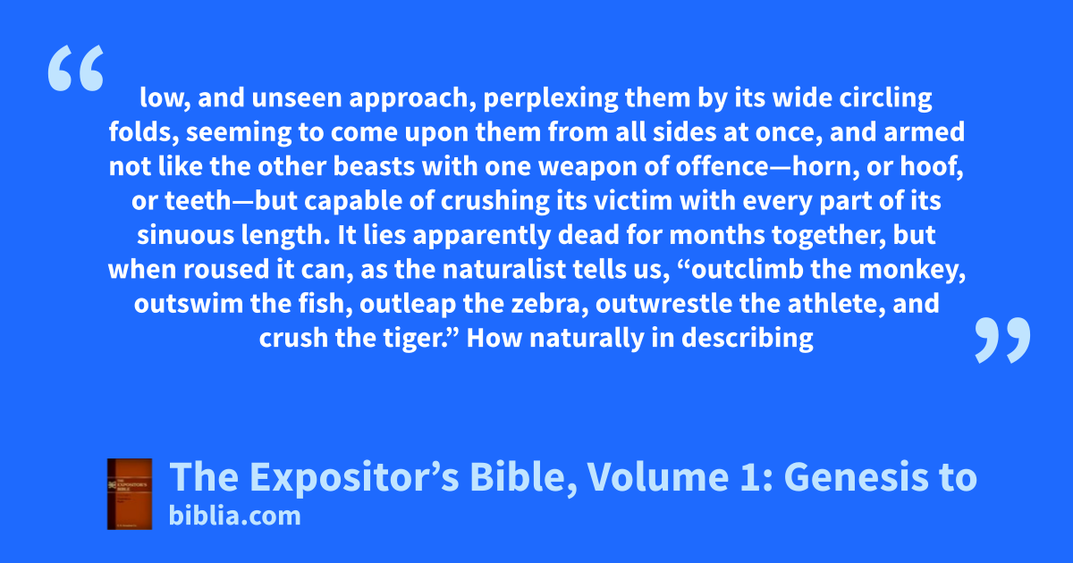 low, and unseen approach, perplexing them by its wide circling folds, seeming to come upon them from all sides at once, and armed not like the other beasts with one weapon of offence—horn, or hoof, or teeth—but capable of crushing its victim with every part of its sinuous length. It lies apparently dead for months together, but when roused it can, as the naturalist tells us, “outclimb the monkey, outswim the fish, outleap the zebra, outwrestle the athlete, and crush the tiger.” How naturally in describing