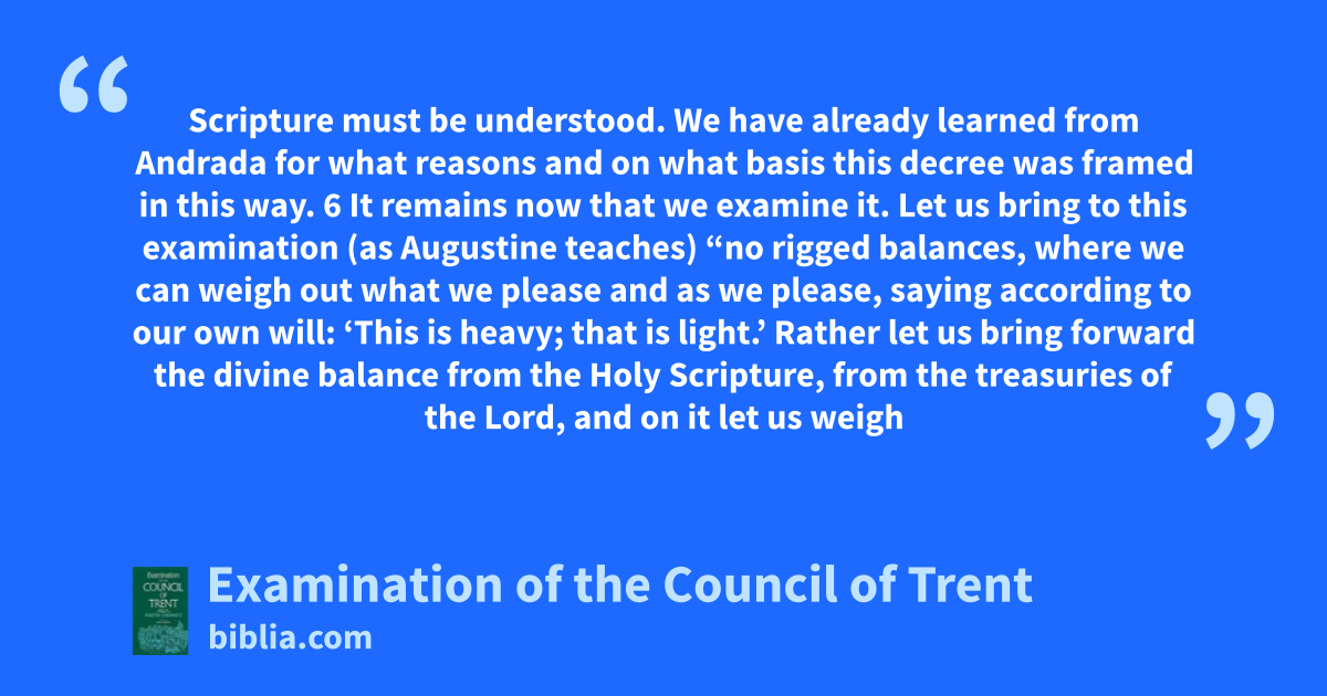 Scripture must be understood. We have already learned from Andrada for what reasons and on what basis this decree was framed in this way. 6 It remains now that we examine it. Let us bring to this examination (as Augustine teaches) “no rigged balances, where we can weigh out what we please and as we please, saying according to our own will: ‘This is heavy; that is light.’ Rather let us bring forward the divine balance from the Holy Scripture, from the treasuries of the Lord, and on it let us weigh