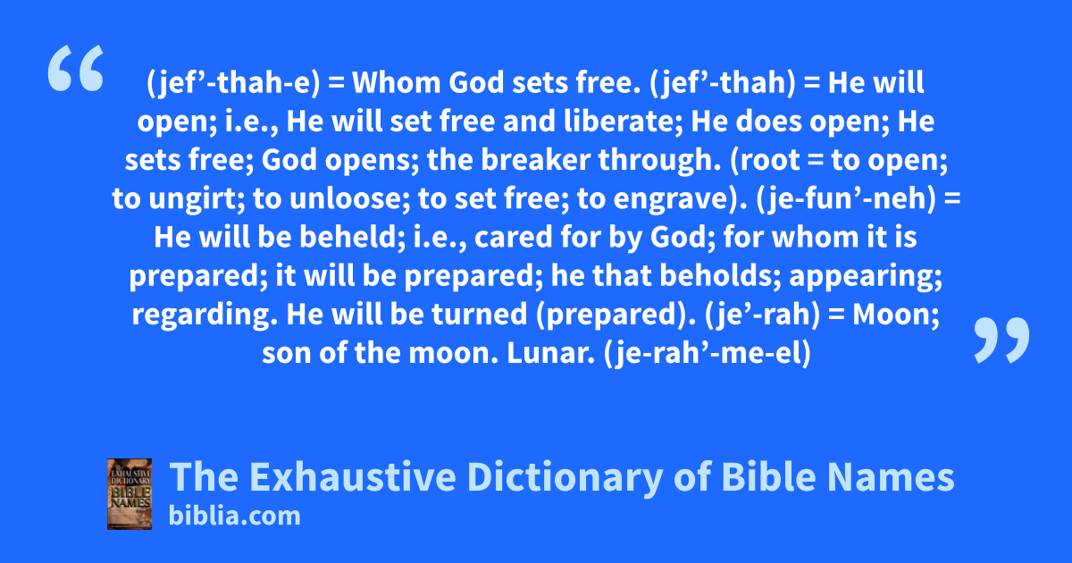 (jef’-thah-e) = Whom God sets free. (jef’-thah) = He will open; i.e., He will set free and liberate; He does open; He sets free; God opens; the breaker through. (root = to open; to ungirt; to unloose; to set free; to engrave). (je-fun’-neh) = He will be beheld; i.e., cared for by God; for whom it is prepared; it will be prepared; he that beholds; appearing; regarding. He will be turned (prepared). (je’-rah) = Moon; son of the moon. Lunar. (je-rah’-me-el)