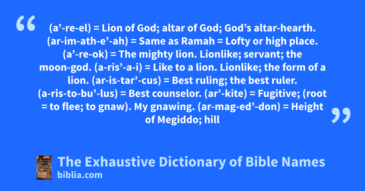 (a’-re-el) = Lion of God; altar of God; God’s altar-hearth. (ar-im-ath-e’-ah) = Same as Ramah = Lofty or high place. (a’-re-ok) = The mighty lion. Lionlike; servant; the moon-god. (a-ris’-a-i) = Like to a lion. Lionlike; the form of a lion. (ar-is-tar’-cus) = Best ruling; the best ruler. (a-ris-to-bu’-lus) = Best counselor. (ar’-kite) = Fugitive; (root = to flee; to gnaw). My gnawing. (ar-mag-ed’-don) = Height of Megiddo; hill
