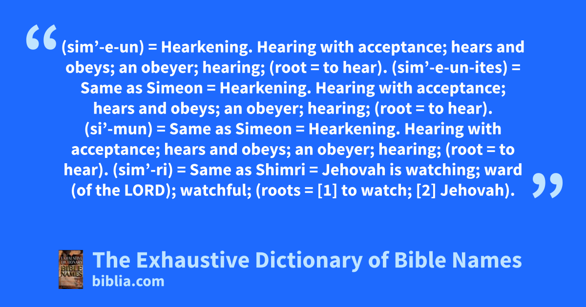 (sim’-e-un) = Hearkening. Hearing with acceptance; hears and obeys; an obeyer; hearing; (root = to hear). (sim’-e-un-ites) = Same as Simeon = Hearkening. Hearing with acceptance; hears and obeys; an obeyer; hearing; (root = to hear). (si’-mun) = Same as Simeon = Hearkening. Hearing with acceptance; hears and obeys; an obeyer; hearing; (root = to hear). (sim’-ri) = Same as Shimri = Jehovah is watching; ward (of the LORD); watchful; (roots = [1] to watch; [2] Jehovah).