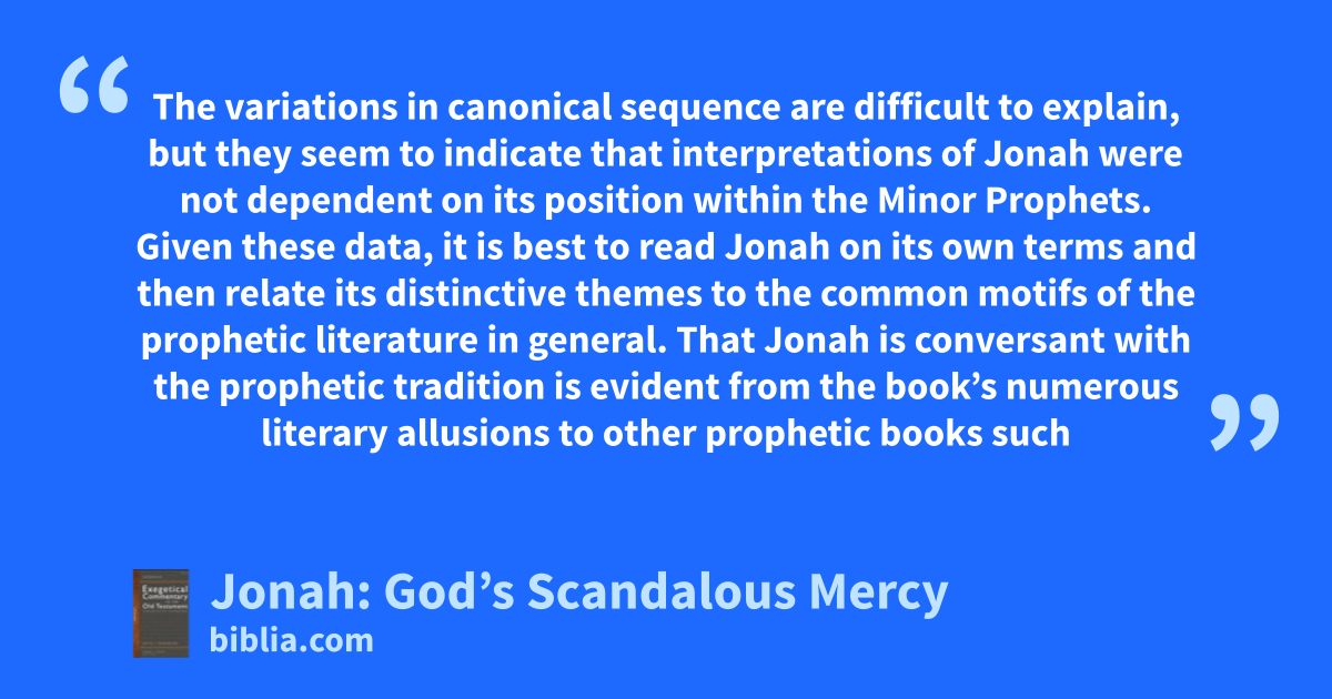 The variations in canonical sequence are difficult to explain, but they seem to indicate that interpretations of Jonah were not dependent on its position within the Minor Prophets. Given these data, it is best to read Jonah on its own terms and then relate its distinctive themes to the common motifs of the prophetic literature in general. That Jonah is conversant with the prophetic tradition is evident from the book’s numerous literary allusions to other prophetic books such