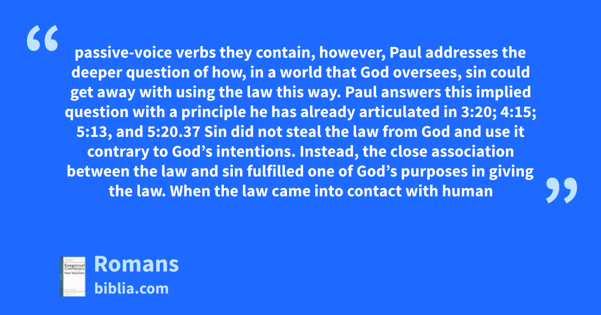 passive-voice verbs they contain, however, Paul addresses the deeper question of how, in a world that God oversees, sin could get away with using the law this way. Paul answers this implied question with a principle he has already articulated in 3:20; 4:15; 5:13, and 5:20.37 Sin did not steal the law from God and use it contrary to God’s intentions. Instead, the close association between the law and sin fulfilled one of God’s purposes in giving the law. When the law came into contact with human