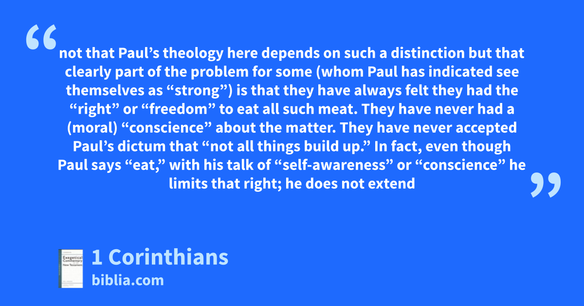 not that Paul’s theology here depends on such a distinction but that clearly part of the problem for some (whom Paul has indicated see themselves as “strong”) is that they have always felt they had the “right” or “freedom” to eat all such meat. They have never had a (moral) “conscience” about the matter. They have never accepted Paul’s dictum that “not all things build up.” In fact, even though Paul says “eat,” with his talk of “self-awareness” or “conscience” he limits that right; he does not extend