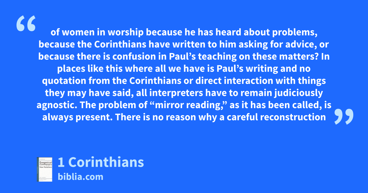 of women in worship because he has heard about problems, because the Corinthians have written to him asking for advice, or because there is confusion in Paul’s teaching on these matters? In places like this where all we have is Paul’s writing and no quotation from the Corinthians or direct interaction with things they may have said, all interpreters have to remain judiciously agnostic. The problem of “mirror reading,” as it has been called, is always present. There is no reason why a careful reconstruction