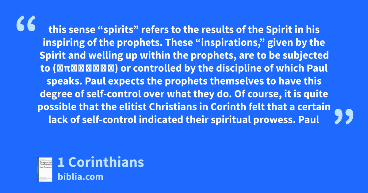 this sense “spirits” refers to the results of the Spirit in his inspiring of the prophets. These “inspirations,” given by the Spirit and welling up within the prophets, are to be subjected to (ὑποτάσσω) or controlled by the discipline of which Paul speaks. Paul expects the prophets themselves to have this degree of self-control over what they do. Of course, it is quite possible that the elitist Christians in Corinth felt that a certain lack of self-control indicated their spiritual prowess. Paul