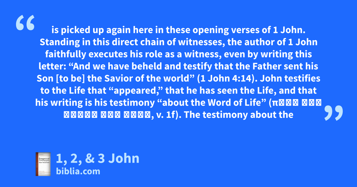 is picked up again here in these opening verses of 1 John. Standing in this direct chain of witnesses, the author of 1 John faithfully executes his role as a witness, even by writing this letter: “And we have beheld and testify that the Father sent his Son [to be] the Savior of the world” (1 John 4:14). John testifies to the Life that “appeared,” that he has seen the Life, and that his writing is his testimony “about the Word of Life” (περὶ τοῦ λόγου τῆς ζωῆς, v. 1f). The testimony about the