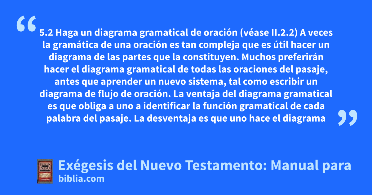 5.2 Haga un diagrama gramatical de oración (véase II.2.2) A veces la gramática de una oración es tan compleja que es útil hacer un diagrama de las partes que la constituyen. Muchos preferirán hacer el diagrama gramatical de todas las oraciones del pasaje, antes que aprender un nuevo sistema, tal como escribir un diagrama de flujo de oración. La ventaja del diagrama gramatical es que obliga a uno a identificar la función gramatical de cada palabra del pasaje. La desventaja es que uno hace el diagrama