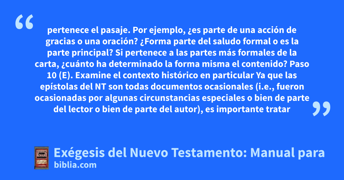 pertenece el pasaje. Por ejemplo, ¿es parte de una acción de gracias o una oración? ¿Forma parte del saludo formal o es la parte principal? Si pertenece a las partes más formales de la carta, ¿cuánto ha determinado la forma misma el contenido? Paso 10 (E). Examine el contexto histórico en particular Ya que las epístolas del NT son todas documentos ocasionales (i.e., fueron ocasionadas por algunas circunstancias especiales o bien de parte del lector o bien de parte del autor), es importante tratar