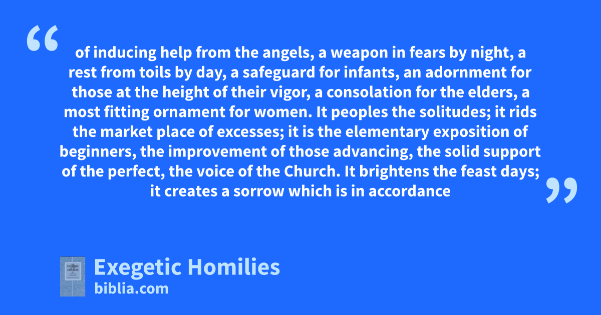 of inducing help from the angels, a weapon in fears by night, a rest from toils by day, a safeguard for infants, an adornment for those at the height of their vigor, a consolation for the elders, a most fitting ornament for women. It peoples the solitudes; it rids the market place of excesses; it is the elementary exposition of beginners, the improvement of those advancing, the solid support of the perfect, the voice of the Church. It brightens the feast days; it creates a sorrow which is in accordance