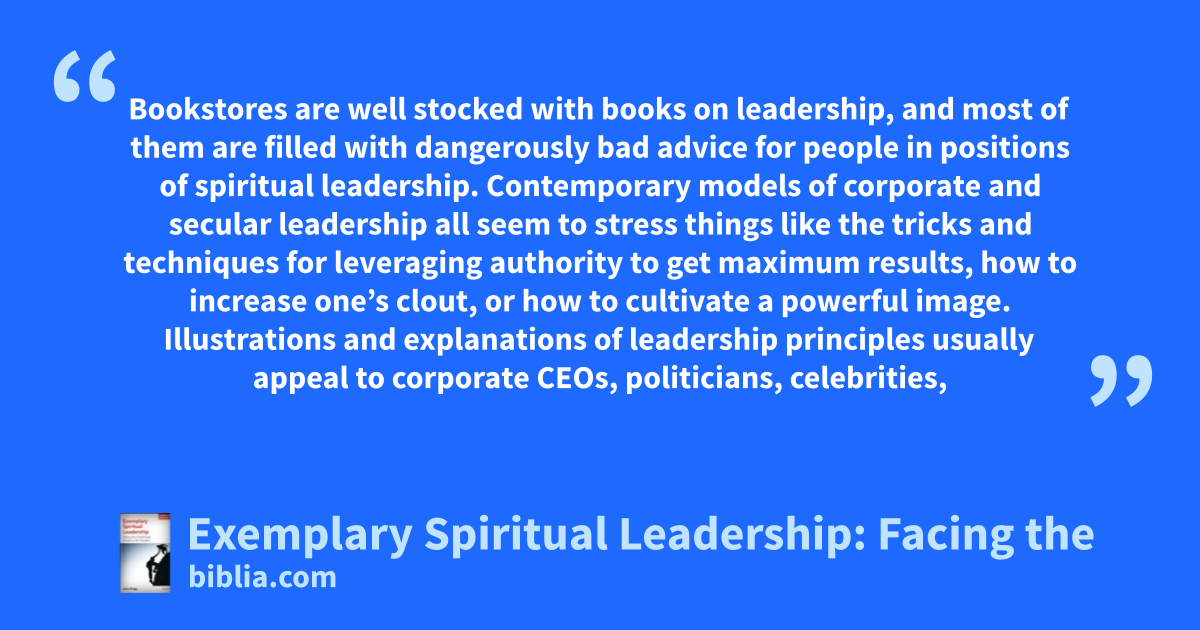 Bookstores are well stocked with books on leadership, and most of them are filled with dangerously bad advice for people in positions of spiritual leadership. Contemporary models of corporate and secular leadership all seem to stress things like the tricks and techniques for leveraging authority to get maximum results, how to increase one’s clout, or how to cultivate a powerful image. Illustrations and explanations of leadership principles usually appeal to corporate CEOs, politicians, celebrities,