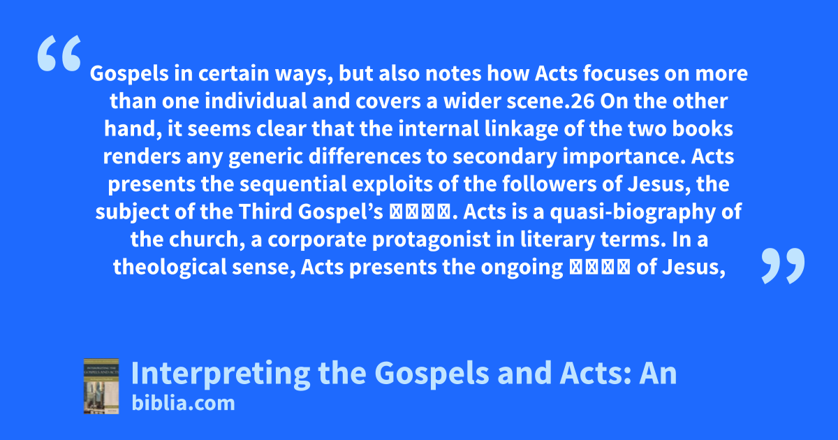 Gospels in certain ways, but also notes how Acts focuses on more than one individual and covers a wider scene.26 On the other hand, it seems clear that the internal linkage of the two books renders any generic differences to secondary importance. Acts presents the sequential exploits of the followers of Jesus, the subject of the Third Gospel’s βίος. Acts is a quasi-biography of the church, a corporate protagonist in literary terms. In a theological sense, Acts presents the ongoing βίος of Jesus,