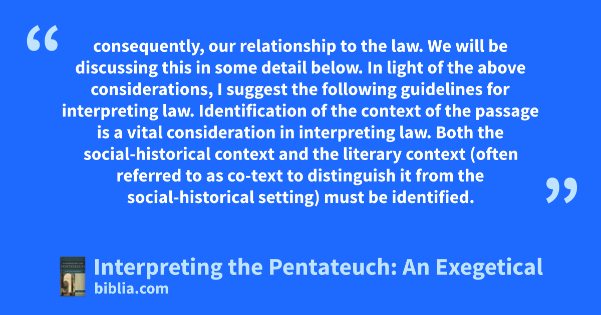 consequently, our relationship to the law. We will be discussing this in some detail below. In light of the above considerations, I suggest the following guidelines for interpreting law. Identification of the context of the passage is a vital consideration in interpreting law. Both the social-historical context and the literary context (often referred to as co-text to distinguish it from the social-historical setting) must be identified.