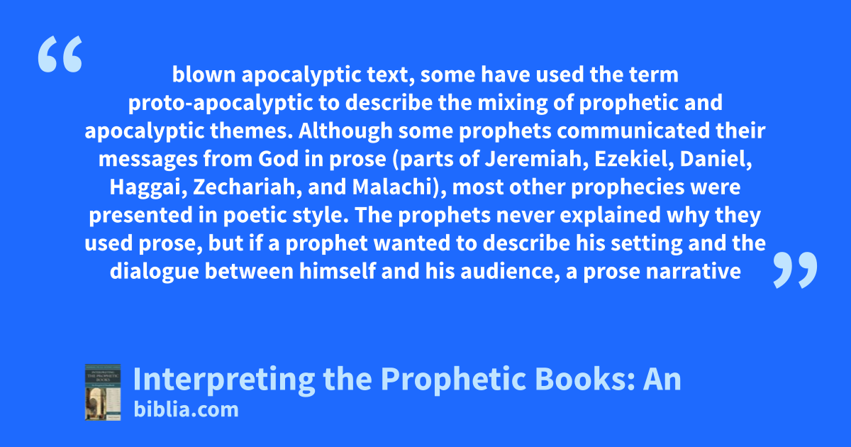 blown apocalyptic text, some have used the term proto-apocalyptic to describe the mixing of prophetic and apocalyptic themes. Although some prophets communicated their messages from God in prose (parts of Jeremiah, Ezekiel, Daniel, Haggai, Zechariah, and Malachi), most other prophecies were presented in poetic style. The prophets never explained why they used prose, but if a prophet wanted to describe his setting and the dialogue between himself and his audience, a prose narrative