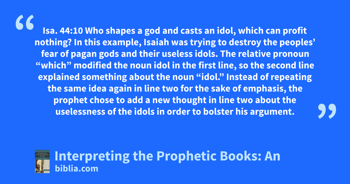Isa. 44:10 Who shapes a god and casts an idol, which can profit nothing? In this example, Isaiah was trying to destroy the peoples’ fear of pagan gods and their useless idols. The relative pronoun “which” modified the noun idol in the first line, so the second line explained something about the noun “idol.” Instead of repeating the same idea again in line two for the sake of emphasis, the prophet chose to add a new thought in line two about the uselessness of the idols in order to bolster his argument.