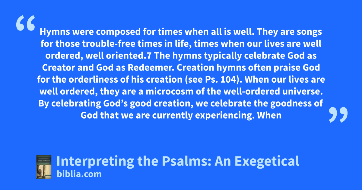 Hymns were composed for times when all is well. They are songs for those trouble-free times in life, times when our lives are well ordered, well oriented.7 The hymns typically celebrate God as Creator and God as Redeemer. Creation hymns often praise God for the orderliness of his creation (see Ps. 104). When our lives are well ordered, they are a microcosm of the well-ordered universe. By celebrating God’s good creation, we celebrate the goodness of God that we are currently experiencing. When