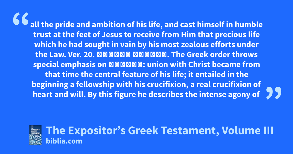 all the pride and ambition of his life, and cast himself in humble trust at the feet of Jesus to receive from Him that precious life which he had sought in vain by his most zealous efforts under the Law. Ver. 20. Χριστῷ συνεστ. The Greek order throws special emphasis on Χριστῷ: union with Christ became from that time the central feature of his life; it entailed in the beginning a fellowship with his crucifixion, a real crucifixion of heart and will. By this figure he describes the intense agony of