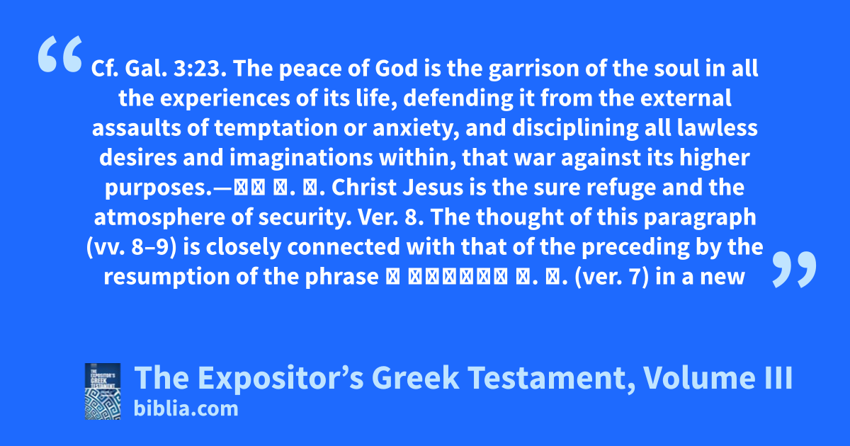 Cf. Gal. 3:23. The peace of God is the garrison of the soul in all the experiences of its life, defending it from the external assaults of temptation or anxiety, and disciplining all lawless desires and imaginations within, that war against its higher purposes.—ἐν Χ. Ἰ. Christ Jesus is the sure refuge and the atmosphere of security. Ver. 8. The thought of this paragraph (vv. 8–9) is closely connected with that of the preceding by the resumption of the phrase ἡ εἰρήνη τ. Θ. (ver. 7) in a new