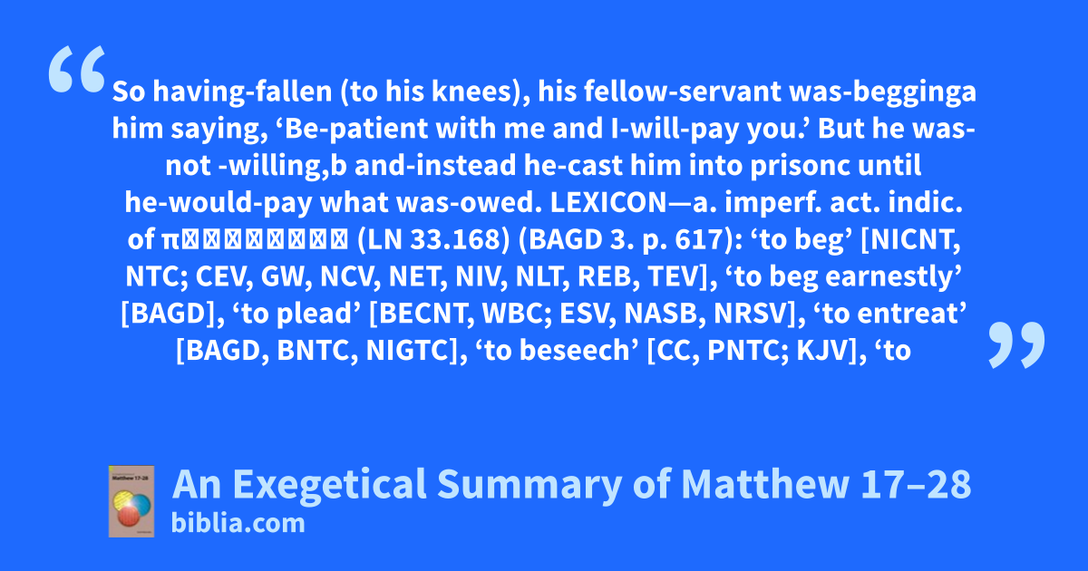 So having-fallen (to his knees), his fellow-servant was-begginga him saying, ‘Be-patient with me and I-will-pay you.’  But he was- not -willing,b and-instead he-cast him into prisonc until he-would-pay what was-owed. LEXICON—a. imperf. act. indic. of παρακαλέω (LN 33.168) (BAGD 3. p. 617): ‘to beg’ [NICNT, NTC; CEV, GW, NCV, NET, NIV, NLT, REB, TEV], ‘to beg earnestly’ [BAGD], ‘to plead’ [BECNT, WBC; ESV, NASB, NRSV], ‘to entreat’ [BAGD, BNTC, NIGTC], ‘to beseech’ [CC, PNTC; KJV], ‘to