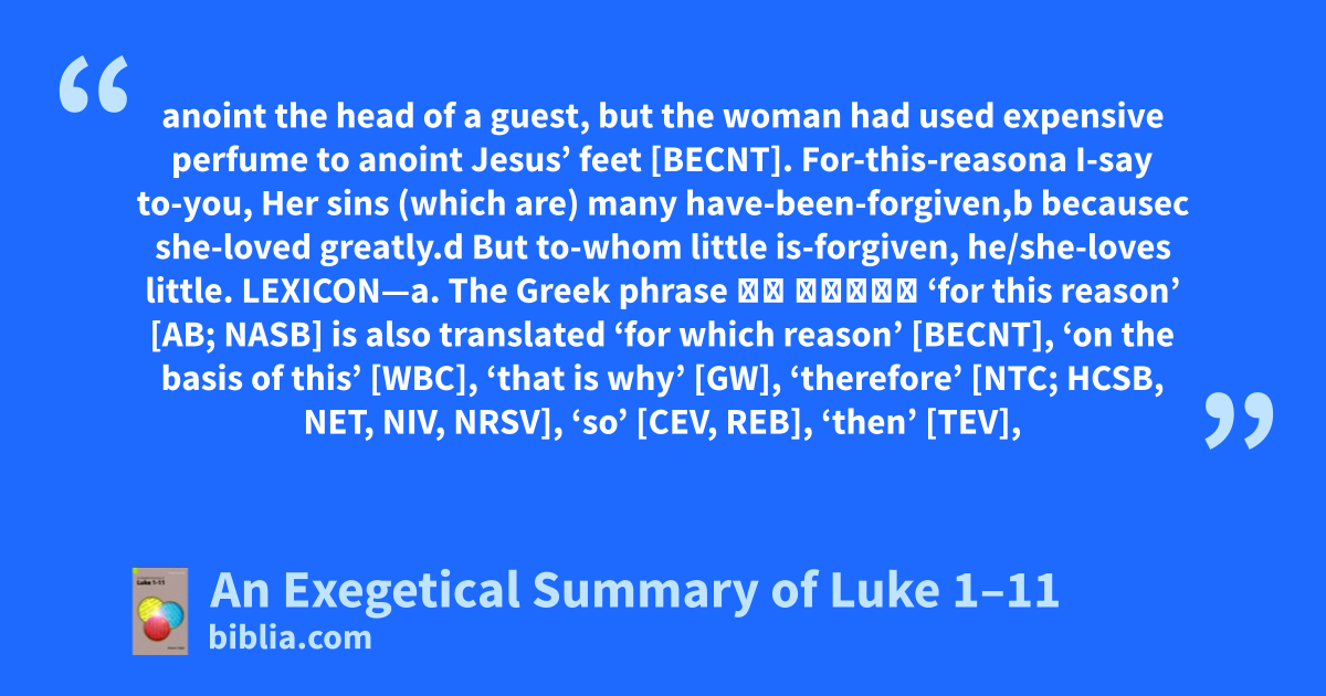 anoint the head of a guest, but the woman had used expensive perfume to anoint Jesus’ feet [BECNT]. For-this-reasona I-say to-you, Her sins (which are) many have-been-forgiven,b becausec she-loved greatly.d But to-whom little is-forgiven, he/she-loves little. LEXICON—a. The Greek phrase οὗ χάριν ‘for this reason’ [AB; NASB] is also translated ‘for which reason’ [BECNT], ‘on the basis of this’ [WBC], ‘that is why’ [GW], ‘therefore’ [NTC; HCSB, NET, NIV, NRSV], ‘so’ [CEV, REB], ‘then’ [TEV],
