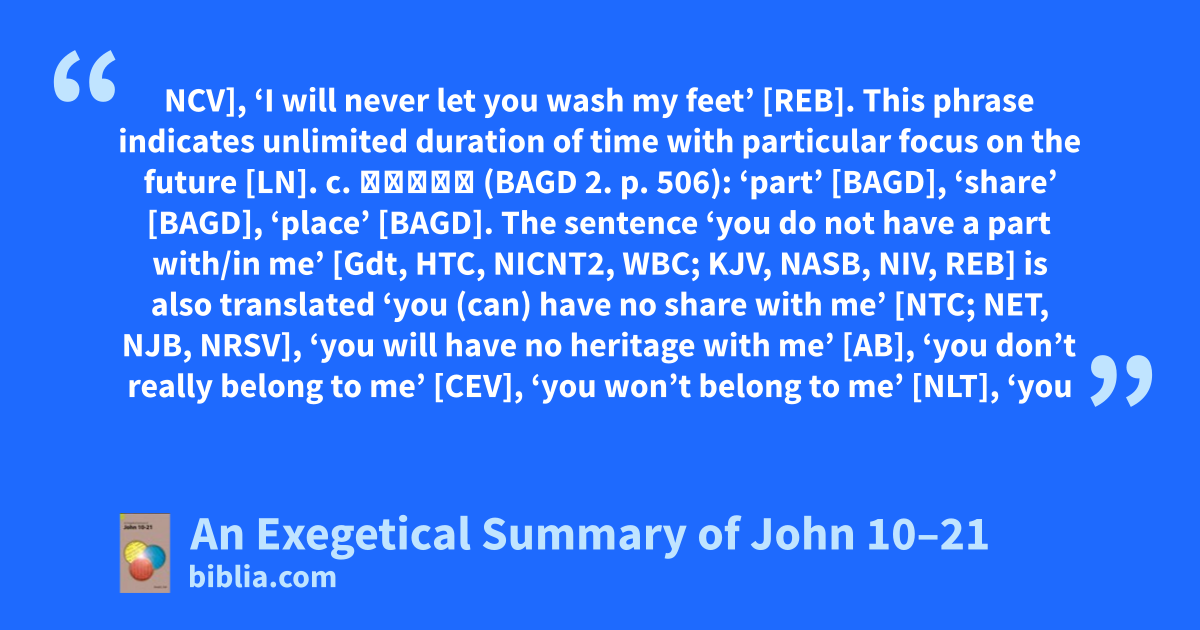 NCV], ‘I will never let you wash my feet’ [REB]. This phrase indicates unlimited duration of time with particular focus on the future [LN]. c. μέρος (BAGD 2. p. 506): ‘part’ [BAGD], ‘share’ [BAGD], ‘place’ [BAGD]. The sentence ‘you do not have a part with/in me’ [Gdt, HTC, NICNT2, WBC; KJV, NASB, NIV, REB] is also translated ‘you (can) have no share with me’ [NTC; NET, NJB, NRSV], ‘you will have no heritage with me’ [AB], ‘you don’t really belong to me’ [CEV], ‘you won’t belong to me’ [NLT], ‘you